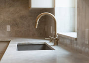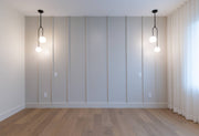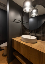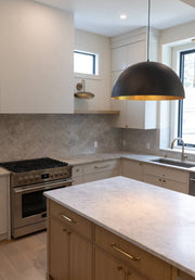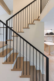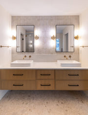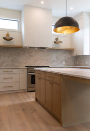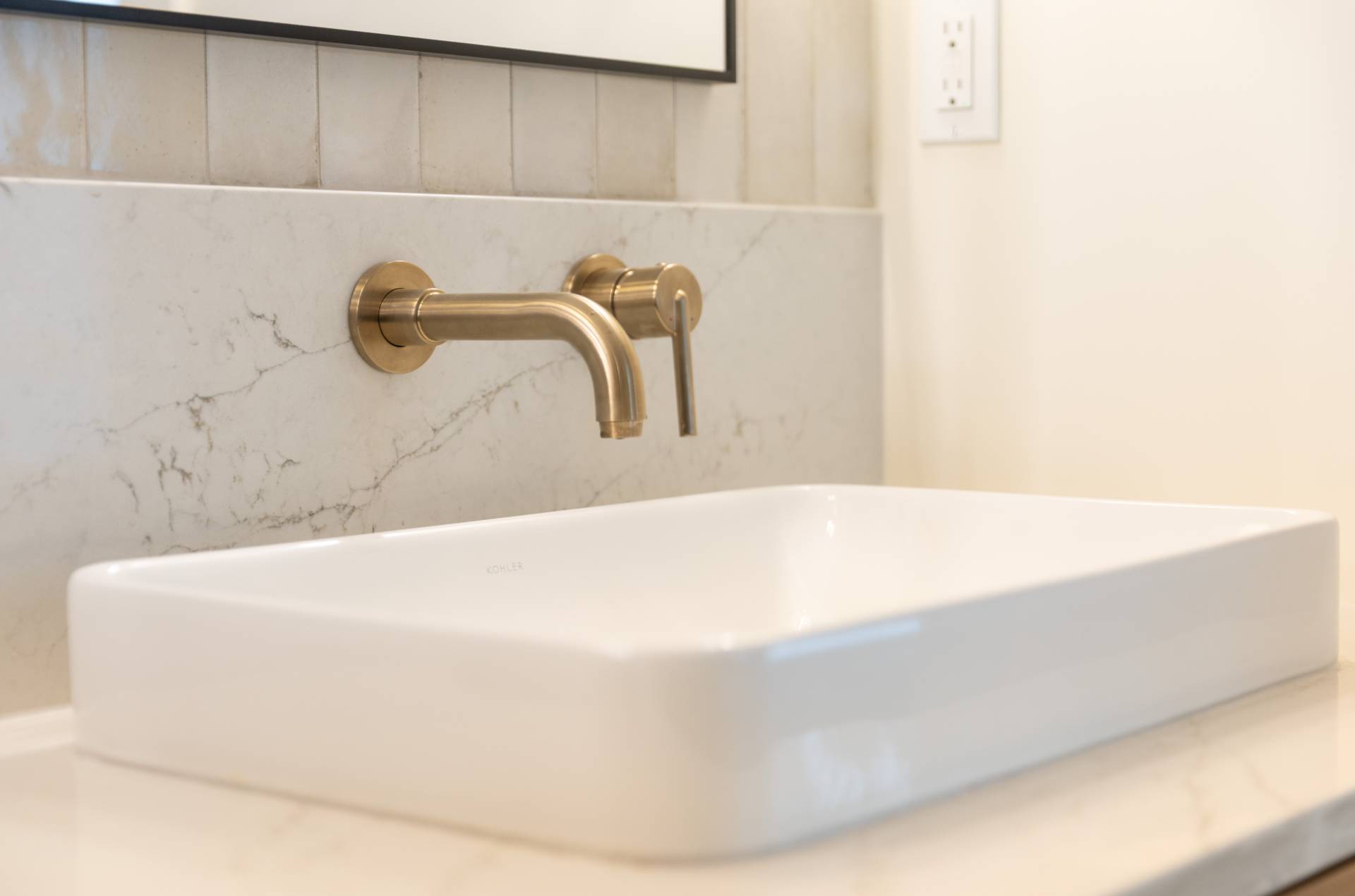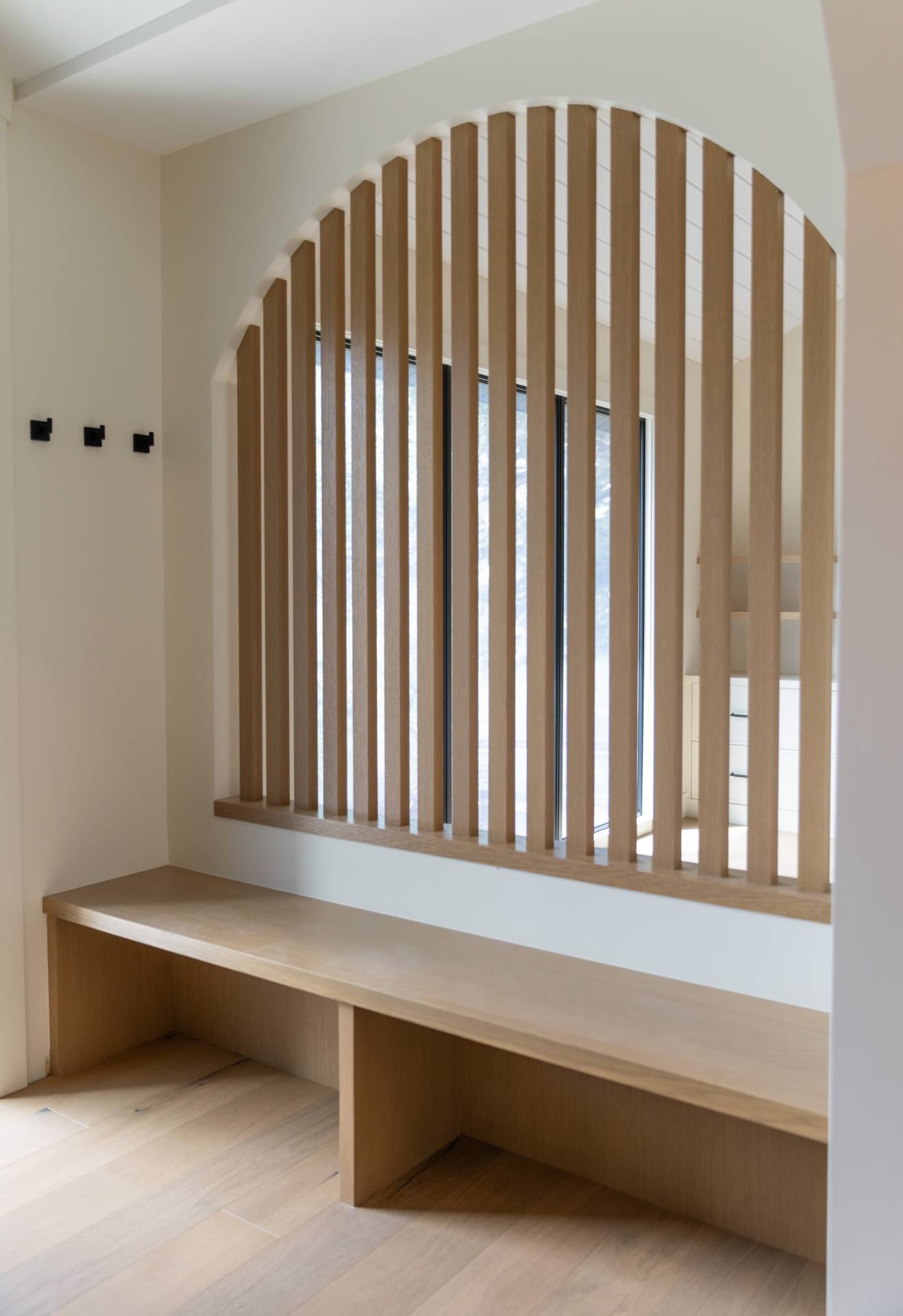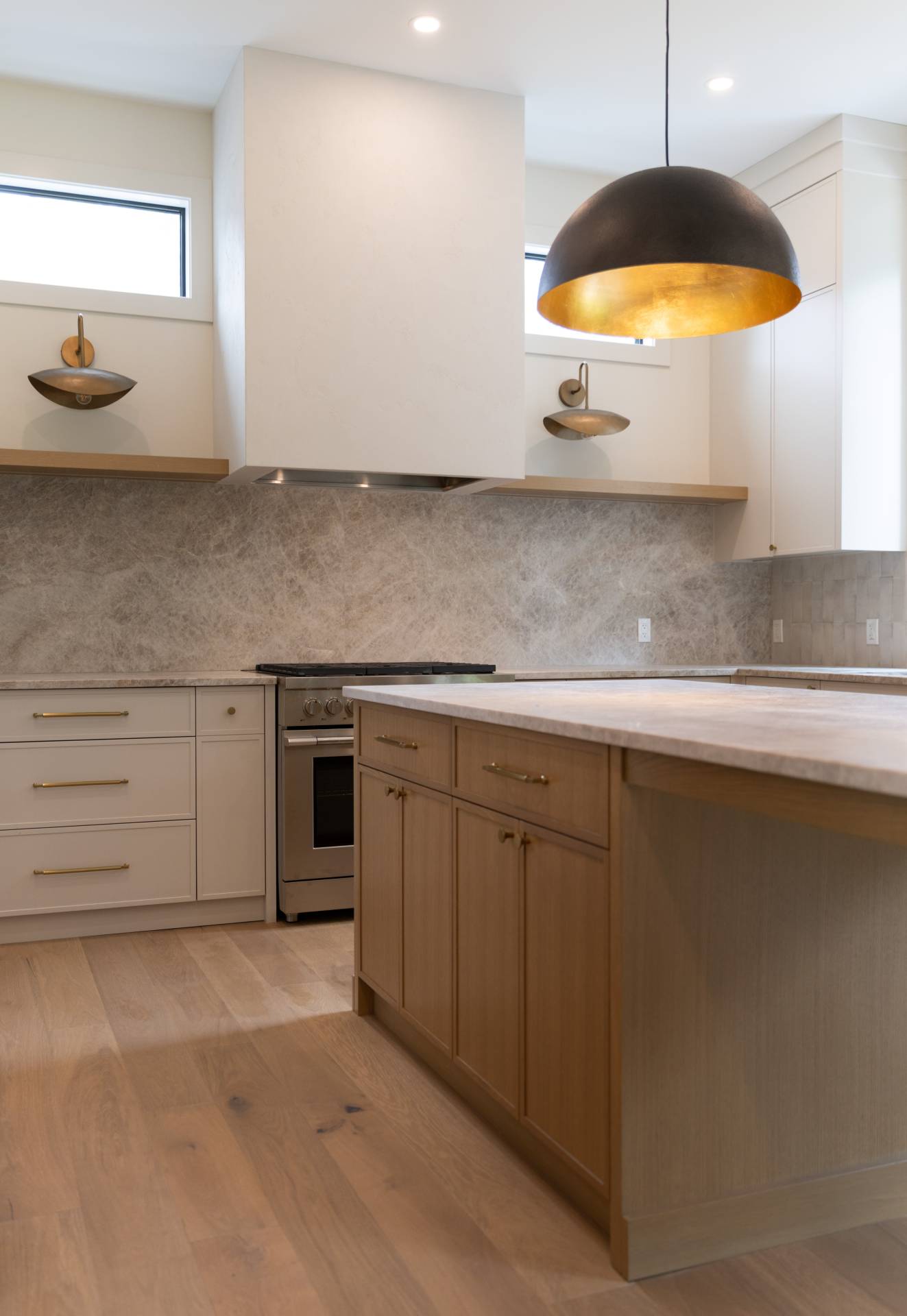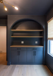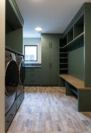Inside, RCID drew all of the interior built-ins, creating custom solutions for the kitchen, vanities, closets, and even dramatic headboard walls in the bedrooms. The color palette for these built-ins was chosen with intention, creating a harmonious flow throughout the home while allowing each space its own unique character. Notable highlights include the introduction of olive green cabinetry in the laundry room, which brings a fresh and contemporary energy to a practical space, and bold black built-ins in the office, adding a sense of sophistication and focus. In the primary bedroom, a creamy, textured headboard wall creates a serene retreat, exuding calm and comfort.