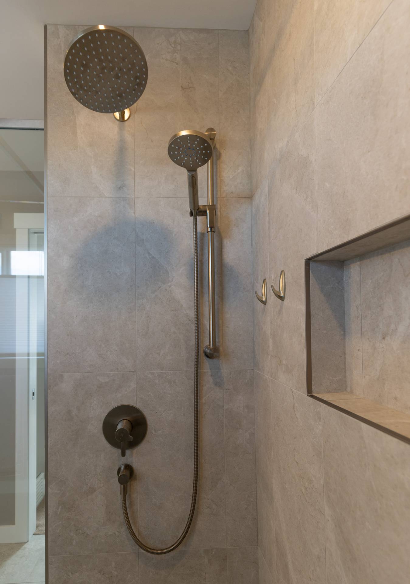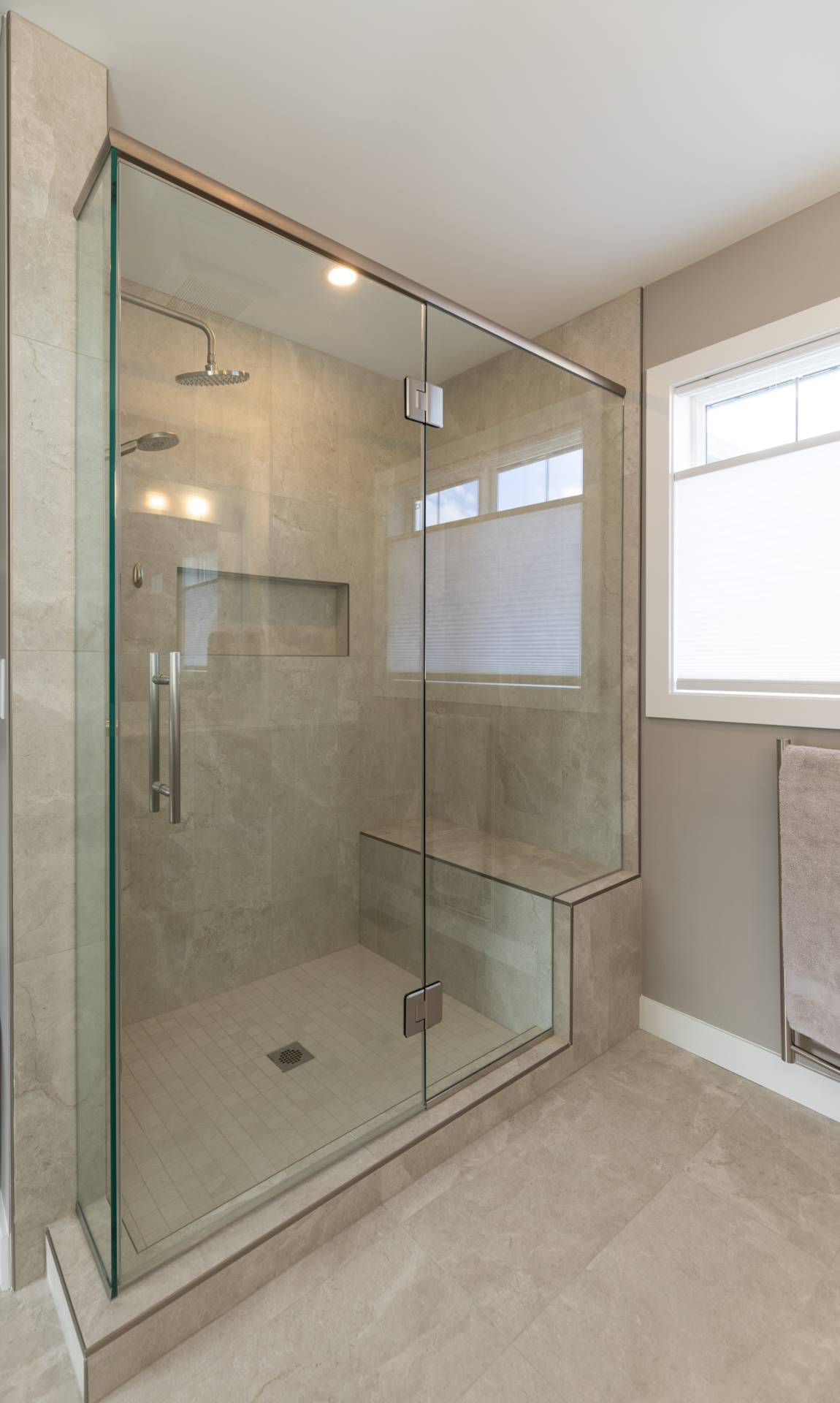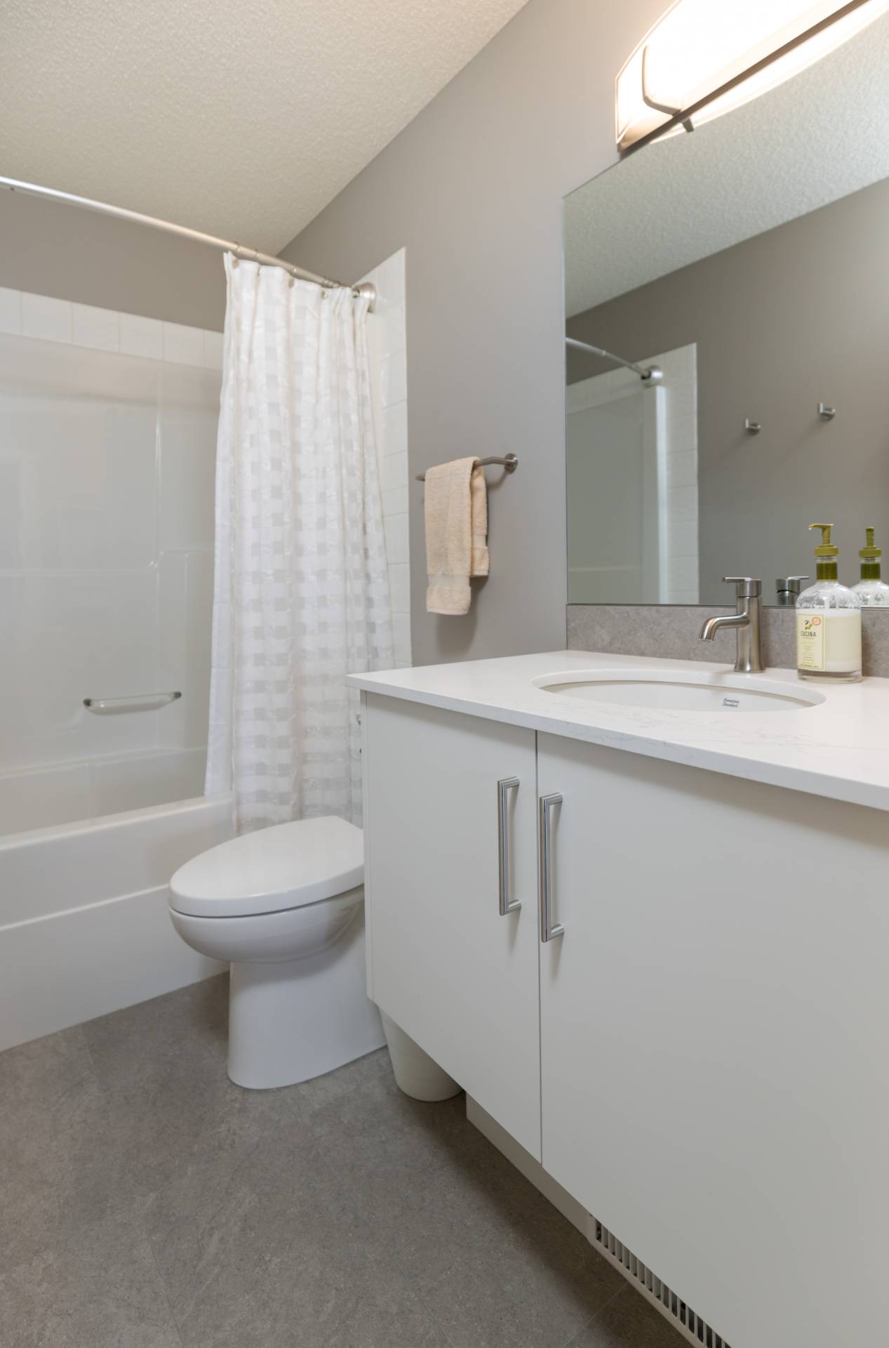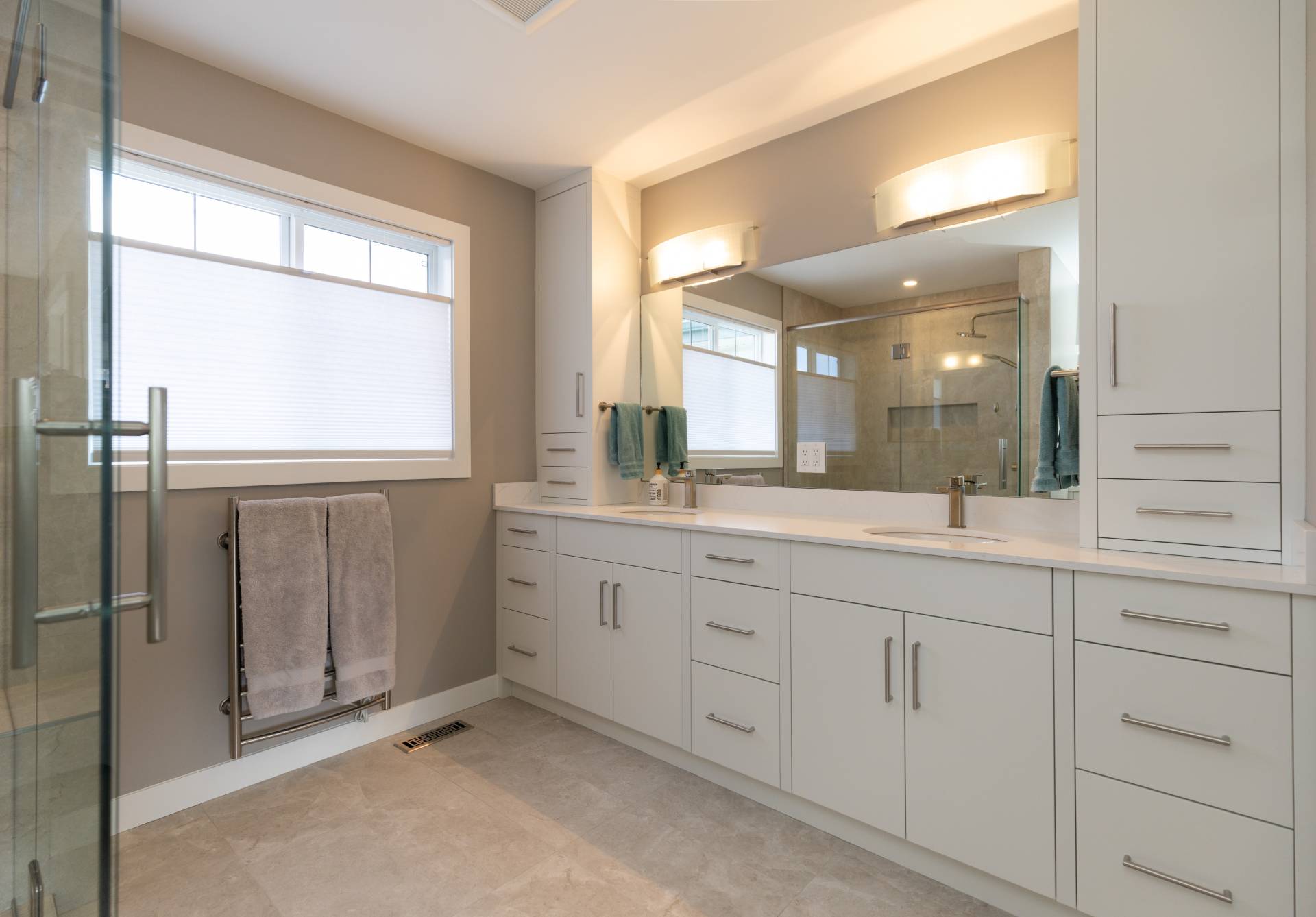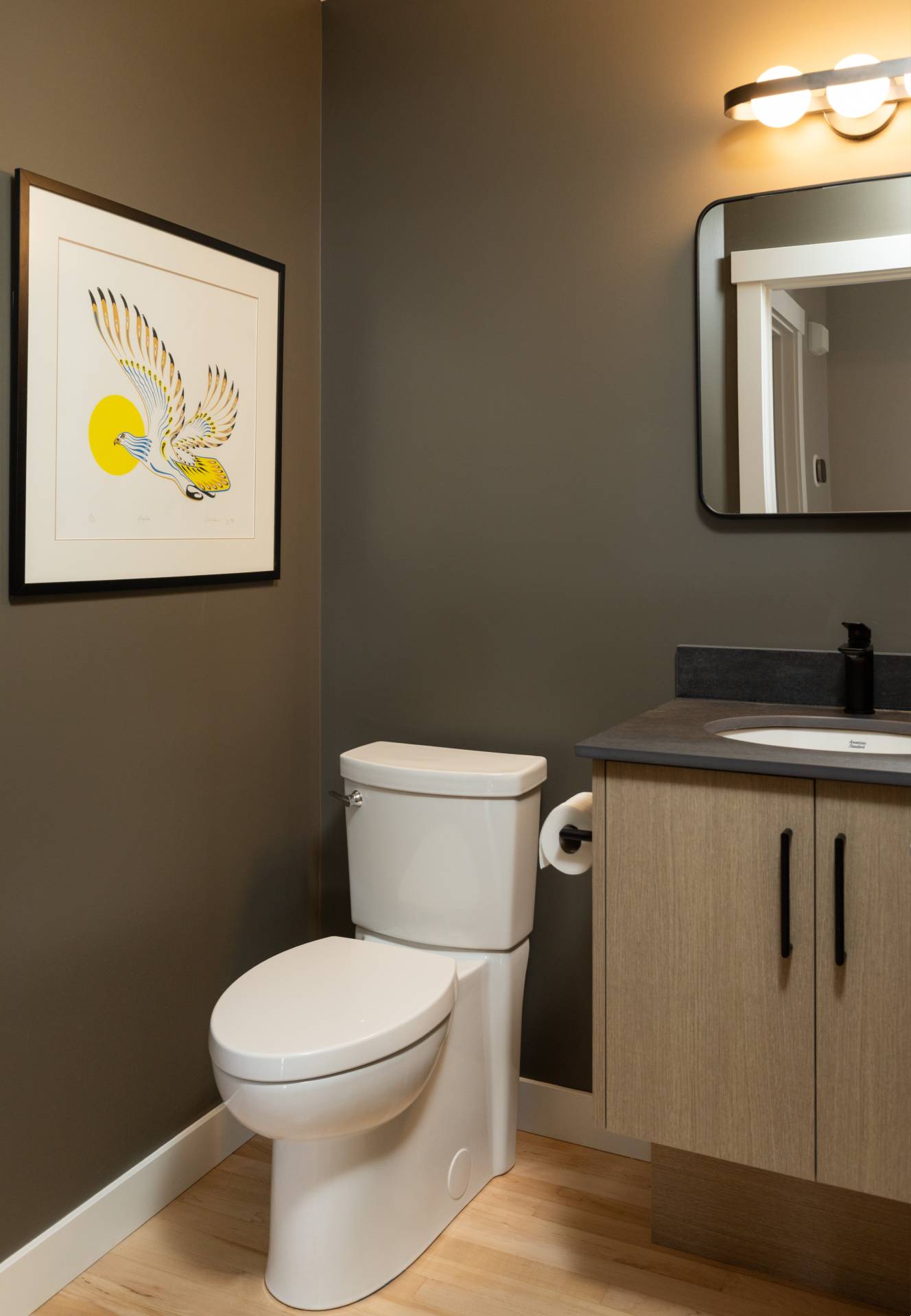 In the powder room, a dramatic dark palette creates a bold visual statement. The main bathroom received updated tile and countertops for a refreshed, modern look. The primary ensuite was redesigned by removing the corner tub and optimizing the vanity area with functional storage towers.