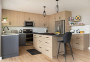 The kitchen features sleek, flat-panel melamine cabinetry—chosen for its modern appearance and remarkable durability. The island is topped with Dekton Bromo, a dark grey, ultra-compact surface inspired by natural slate. This material is not only visually striking but also highly resistant to scratches, stains, heat, and daily impacts, ensuring it will maintain its beauty and functionality for years to come.