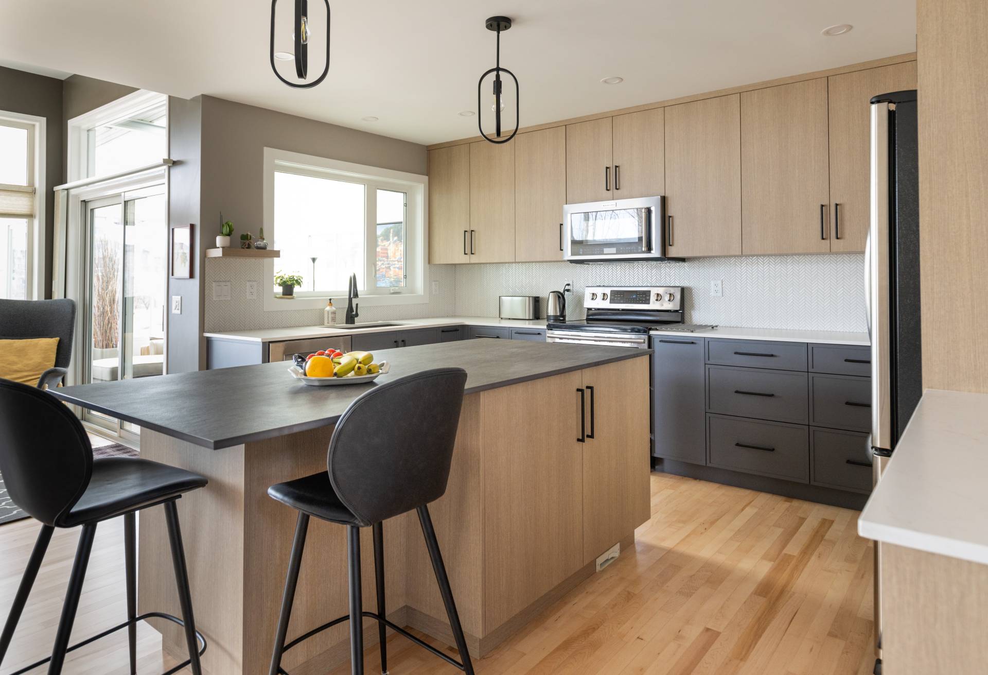 This extensive home renovation in Edgemont, Calgary, backs onto a scenic ravine and was completed for a client seeking a contemporary blend of style and practicality. The walkthrough pantry was reimagined as a dedicated kitchen pantry, while the laundry and mudroom were expanded for improved usability and organization.