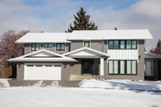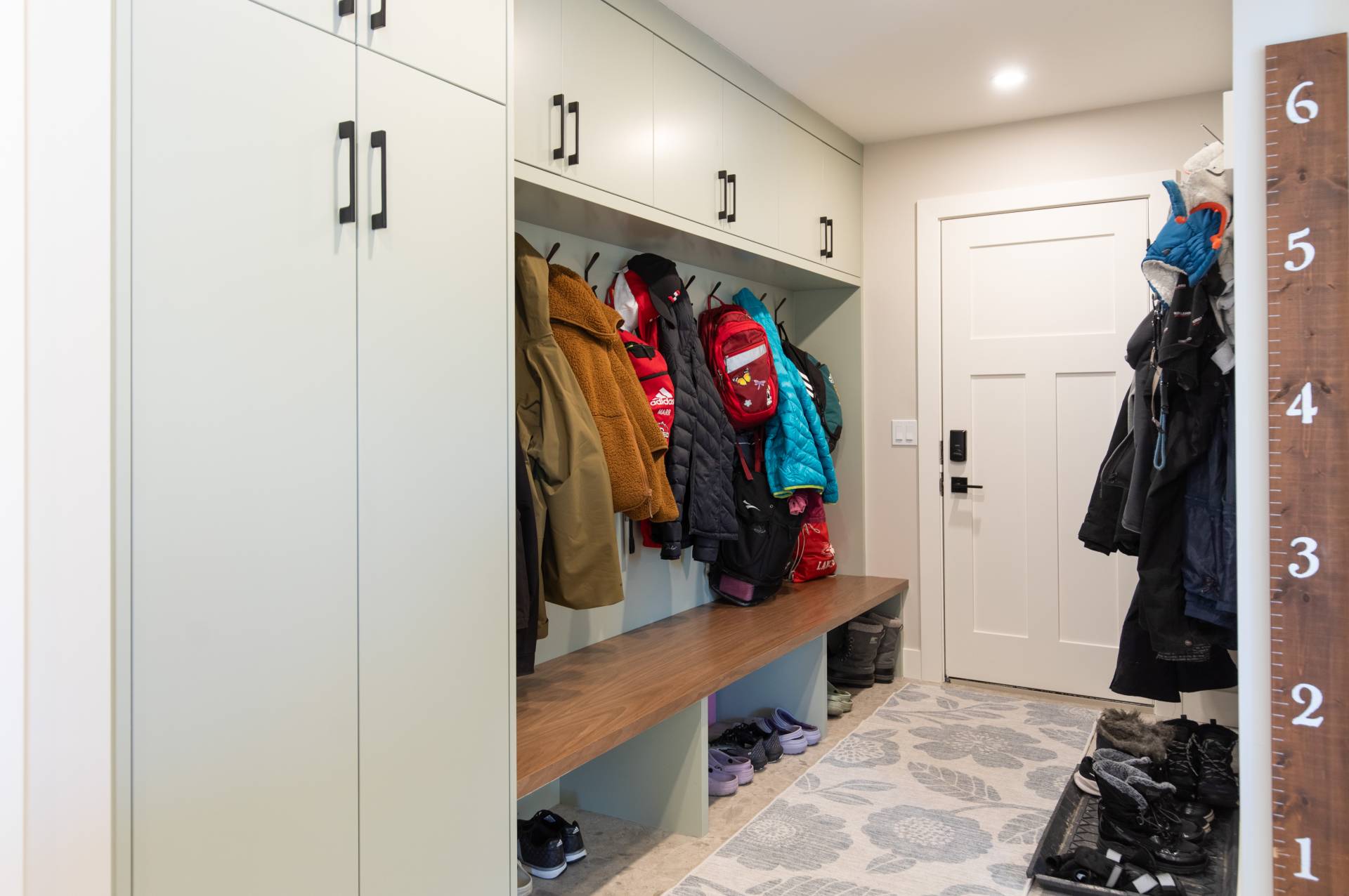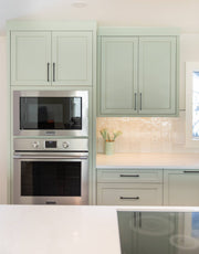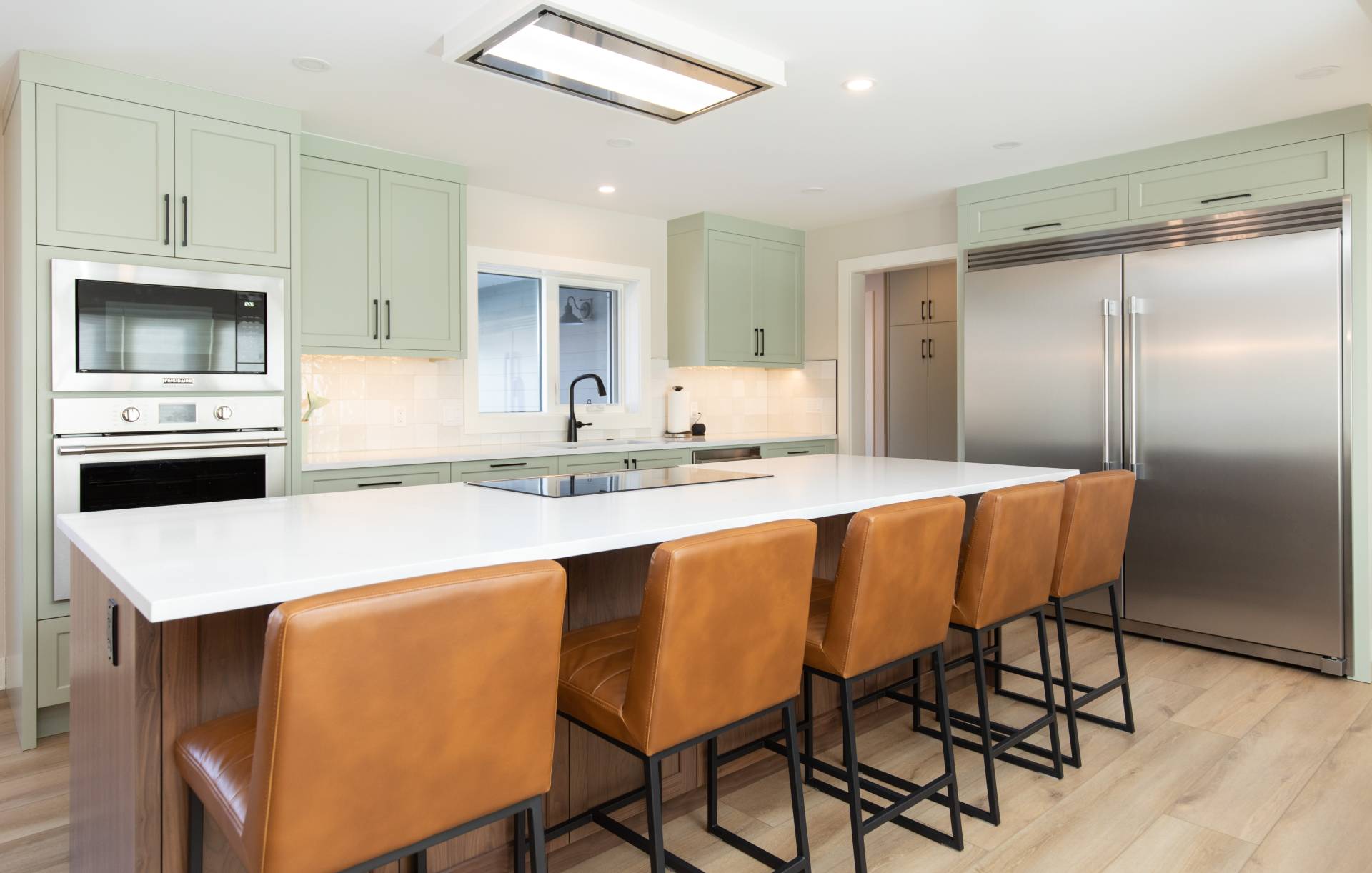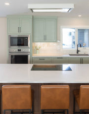This beautiful renovation with an addition in Bonavista was a dream to work on. We worked with this client to open up the main floor to make it functional for entertaining a large family on a regular basis. We had fun with the green kitchen cabinetry and ceiling hoodfan to create a space that the client could cook and engage with their guests. The open floor plan seamlessly connects the kitchen, dining room, and living areas. The large island with seating facilitates social interaction while cooking. The large windows and front door create a bright and inviting atmosphere. The powder room has elegant wallpaper and the addition of a mudroom makes it great for the family to come and go on a daily basis.