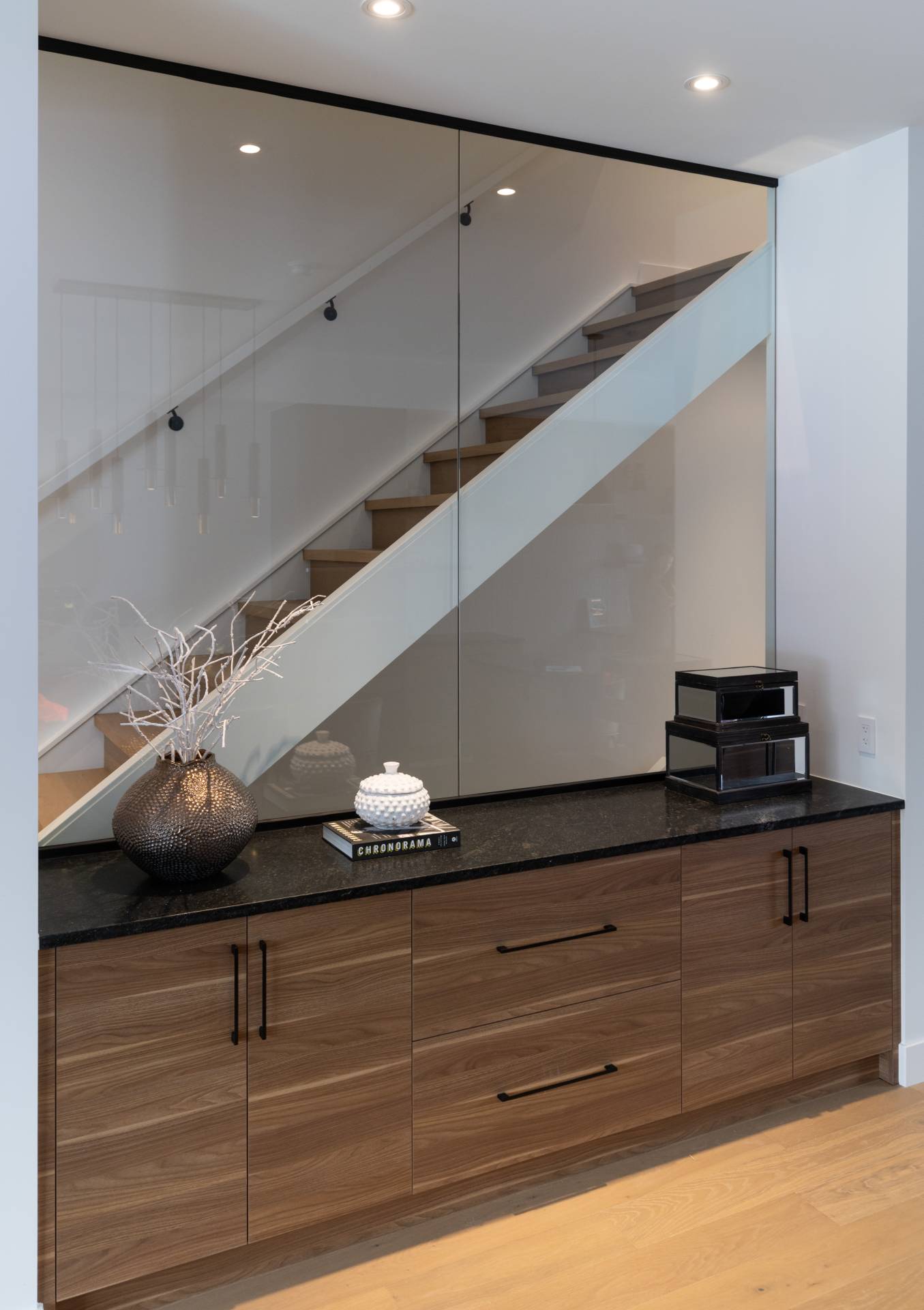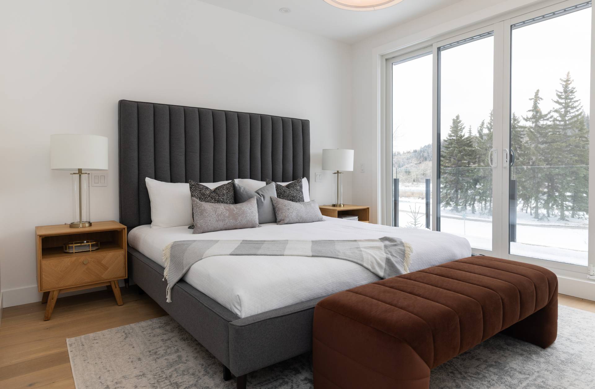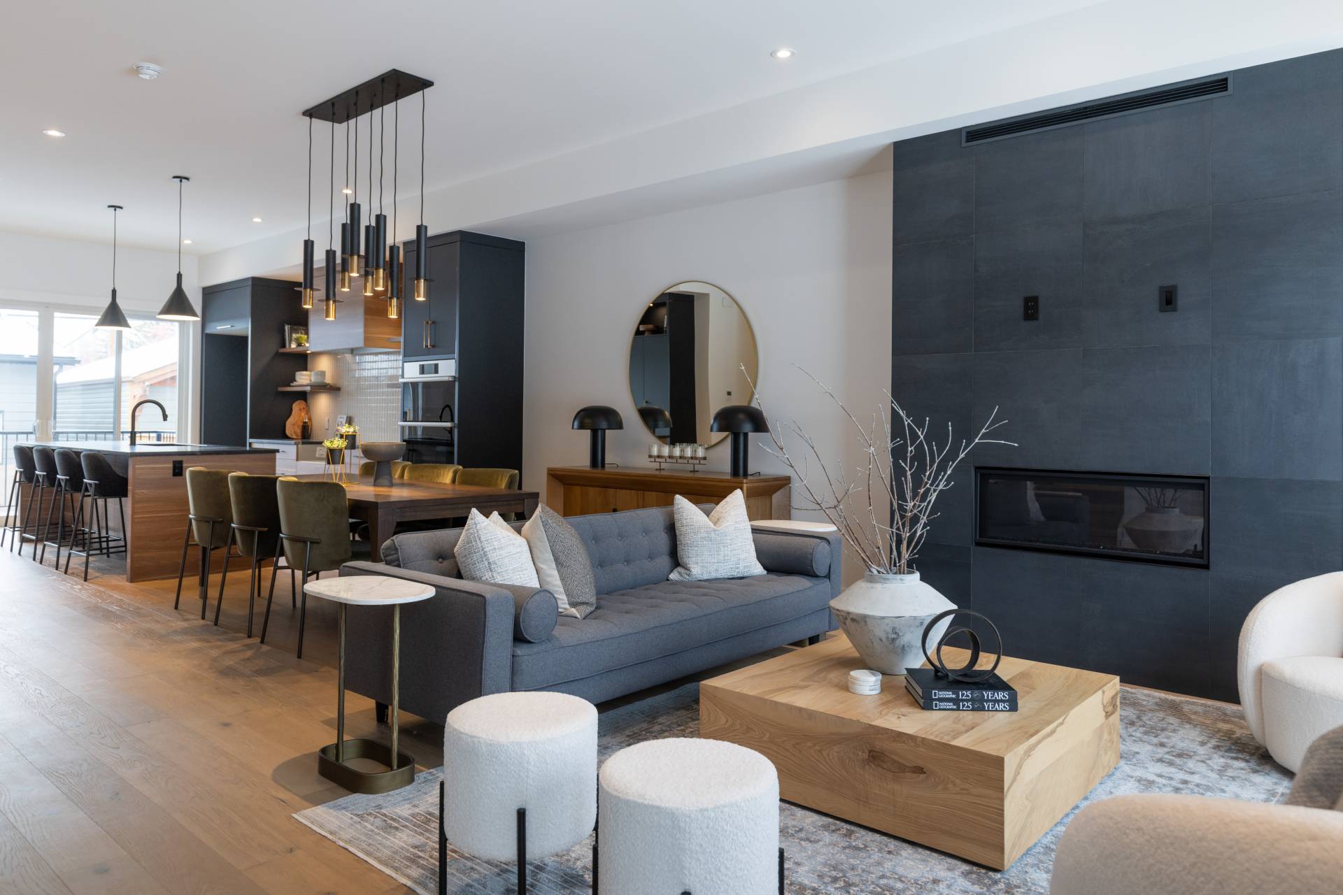 The second floor boasts a primary retreat with a walk-in closet, lavish ensuite, and private outdoor patio overlooking the Bow River. Two additional bedrooms, a full bathroom, and a laundry room complete this level. The third floor is designed for entertainment, featuring a lounge with a wet bar, wine fridge, balcony space, and another bedroom with an ensuite.