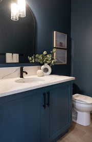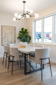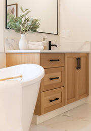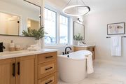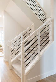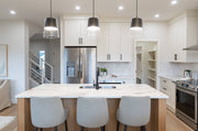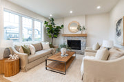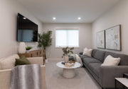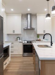 This showhome in Cochrane, Alberta, built by R Space Builders is a beautiful example of soft, inviting interior design paired with exceptional craftsmanship. The living space is anchored by a stunning fireplace clad in Grand Banks limestone, lending both texture and elegance to the heart of the home. The kitchen features a crisp white perimeter that creates a bright, airy atmosphere, perfectly complemented by a soft natural oak island that adds warmth and a touch of organic charm. Custom MDF closets and a spacious pantry provide practical storage solutions while maintaining a seamless, refined aesthetic throughout the home.
