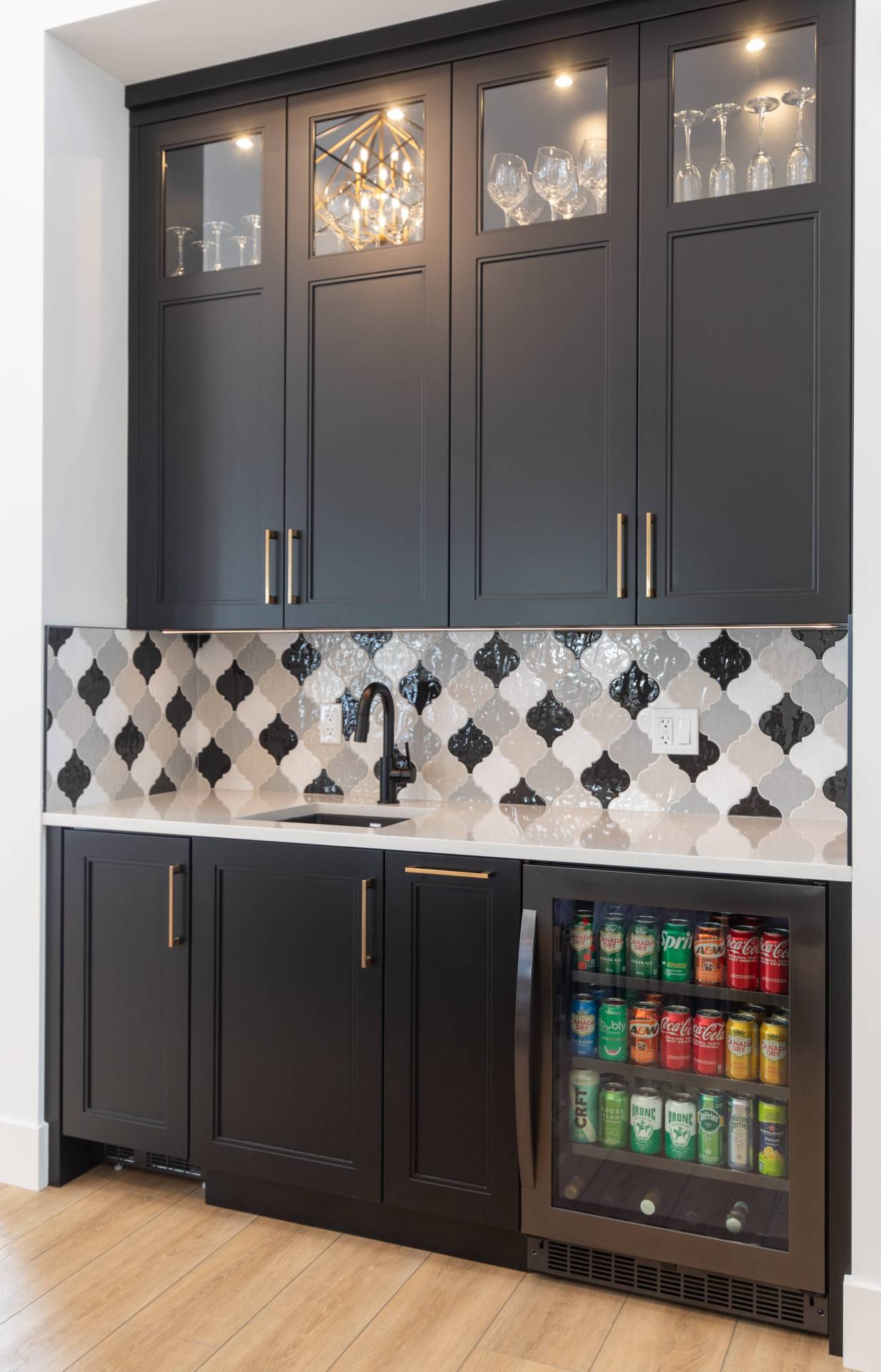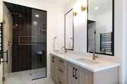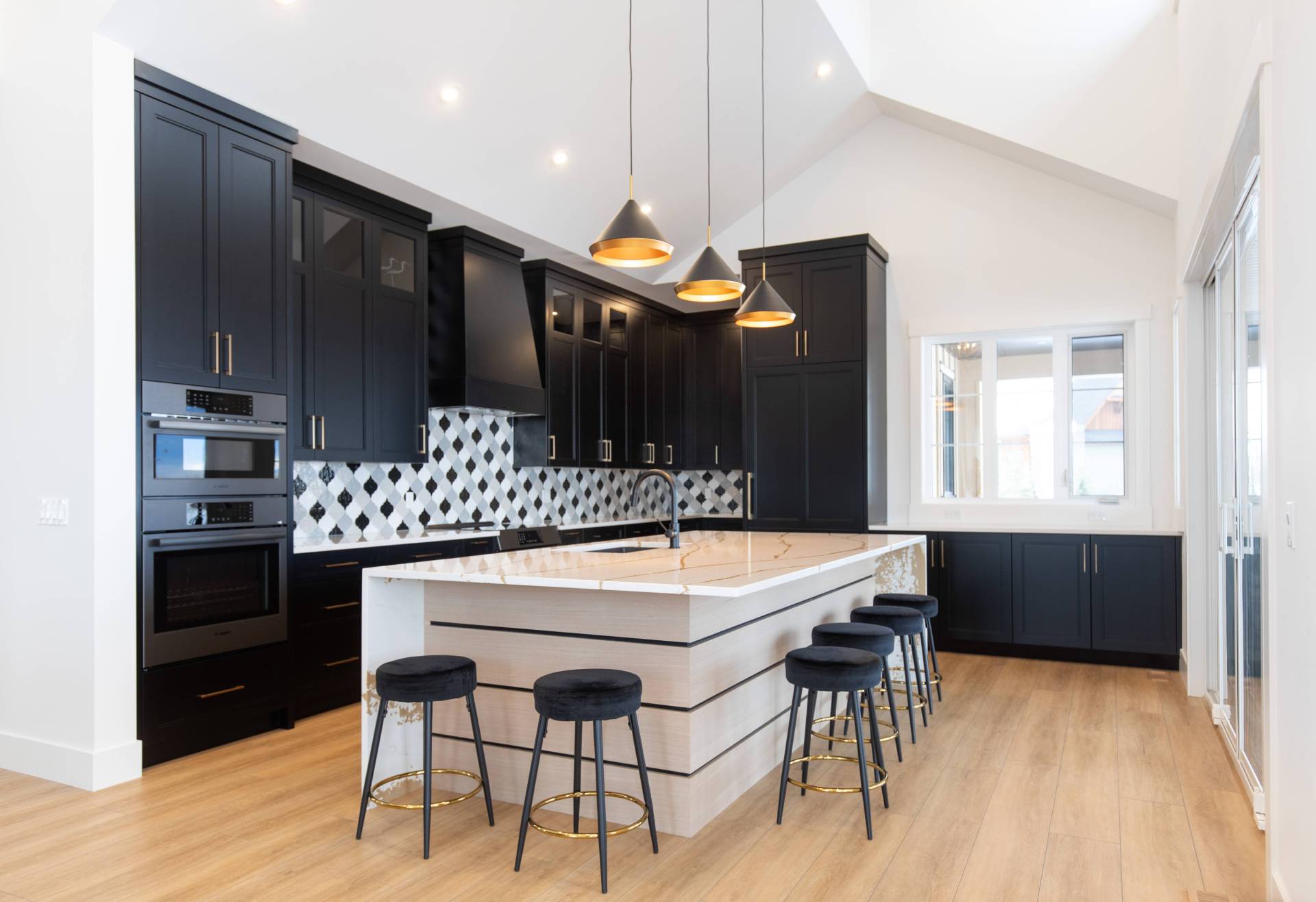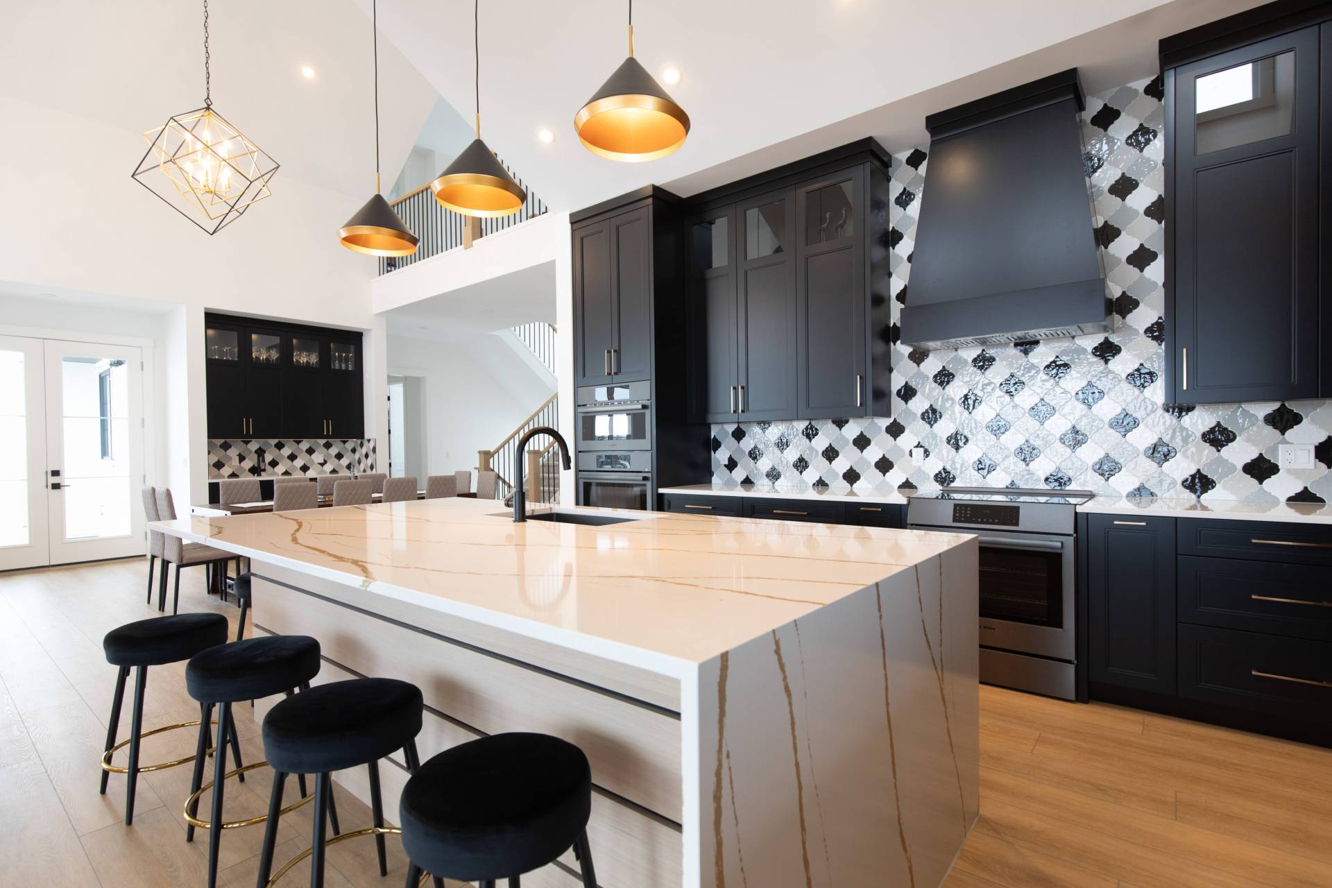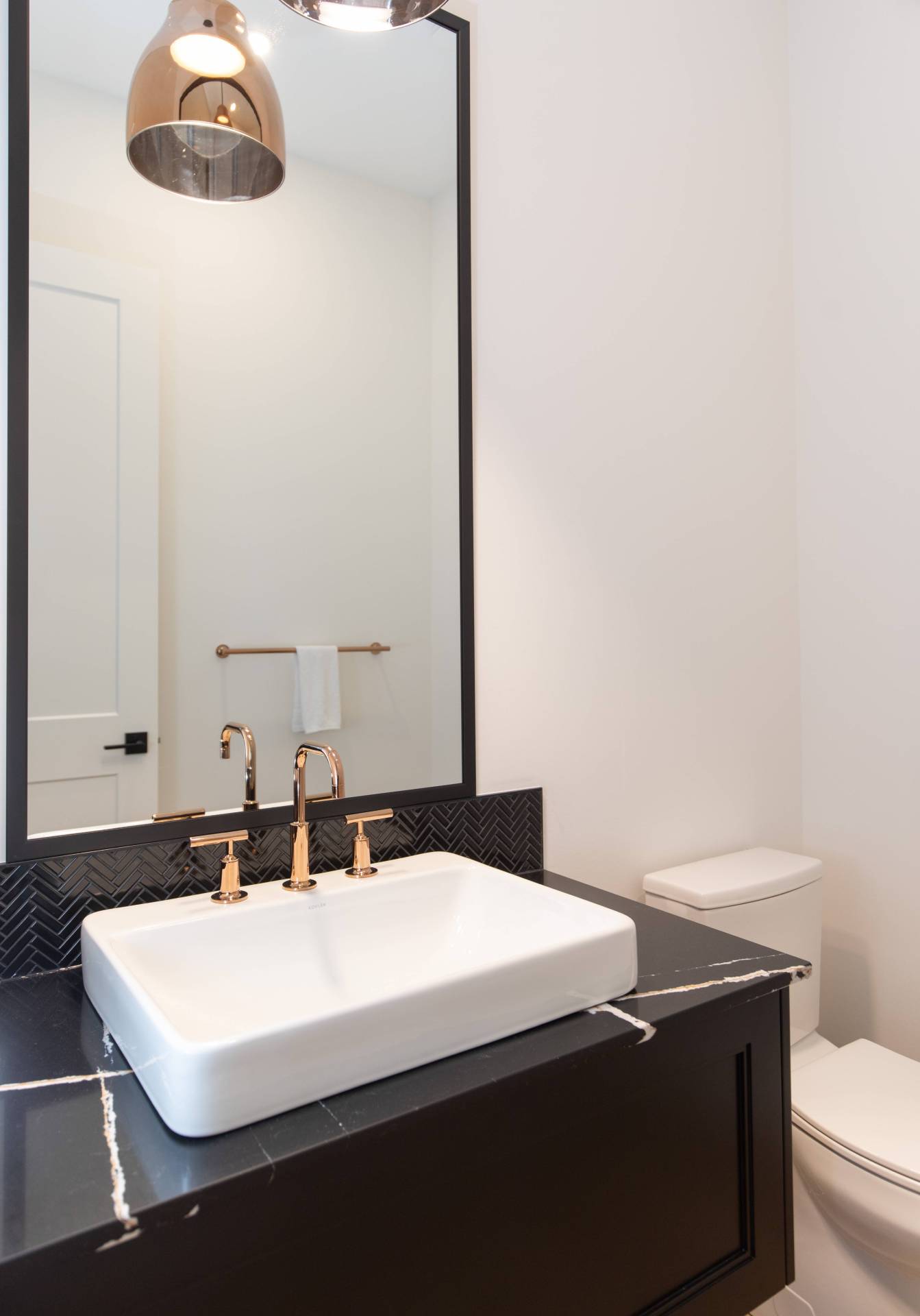 Widesky Custom Homes has recently completed this stunning new build in the community of Silverhorn that showcases their commitment to luxury and innovation. It was a pleasure to work with this lovely client on the design of their new home. The home features a striking dark kitchen creating a bold and sophisticated atmosphere. Contrasting the moody kitchen, the powder room boasts an eye-cathcing combination of black tile and rose gold plumbing fixtures adding a touch of glamour to the house.