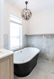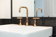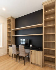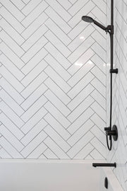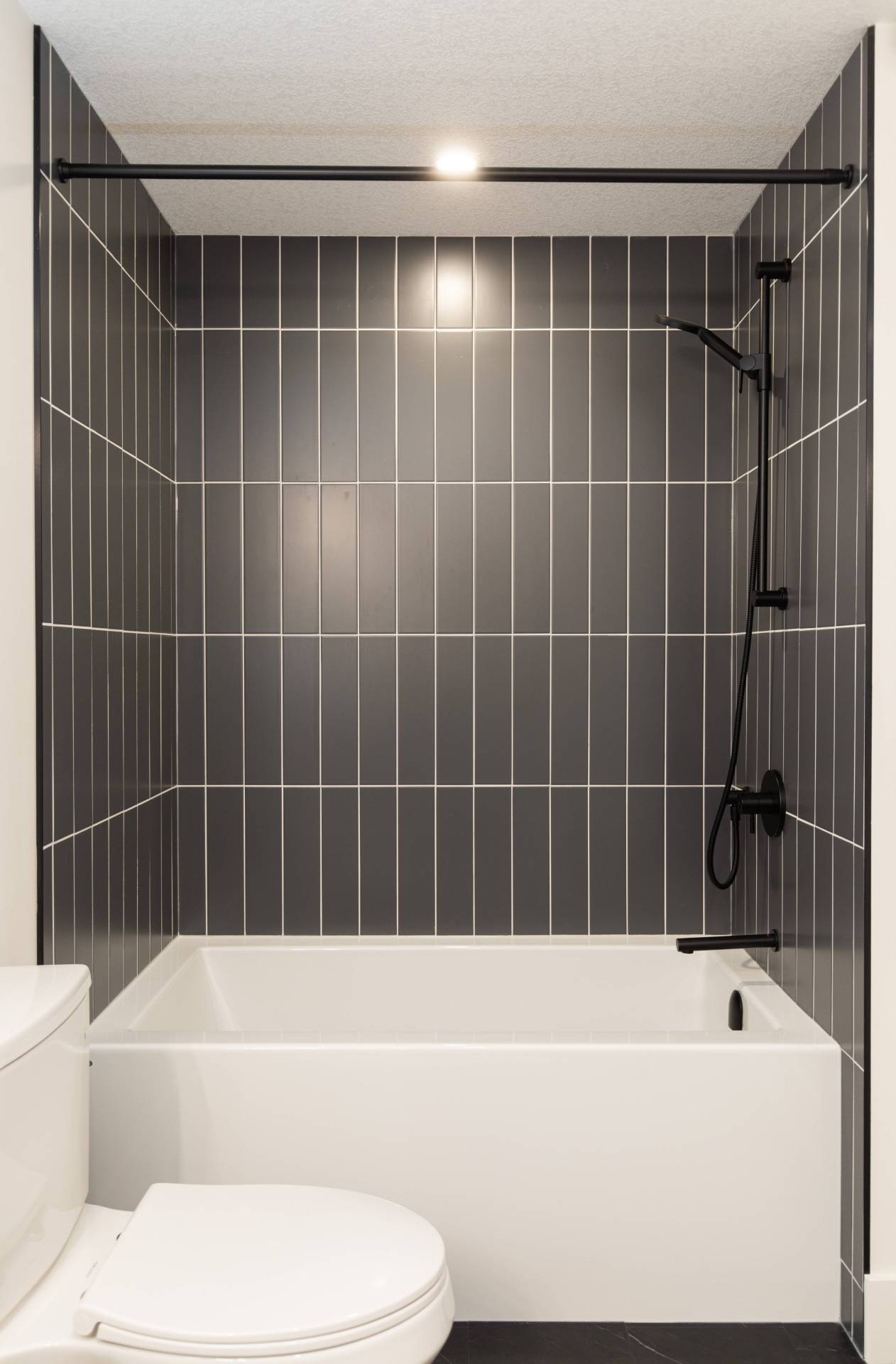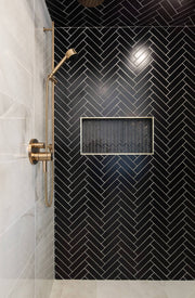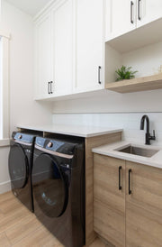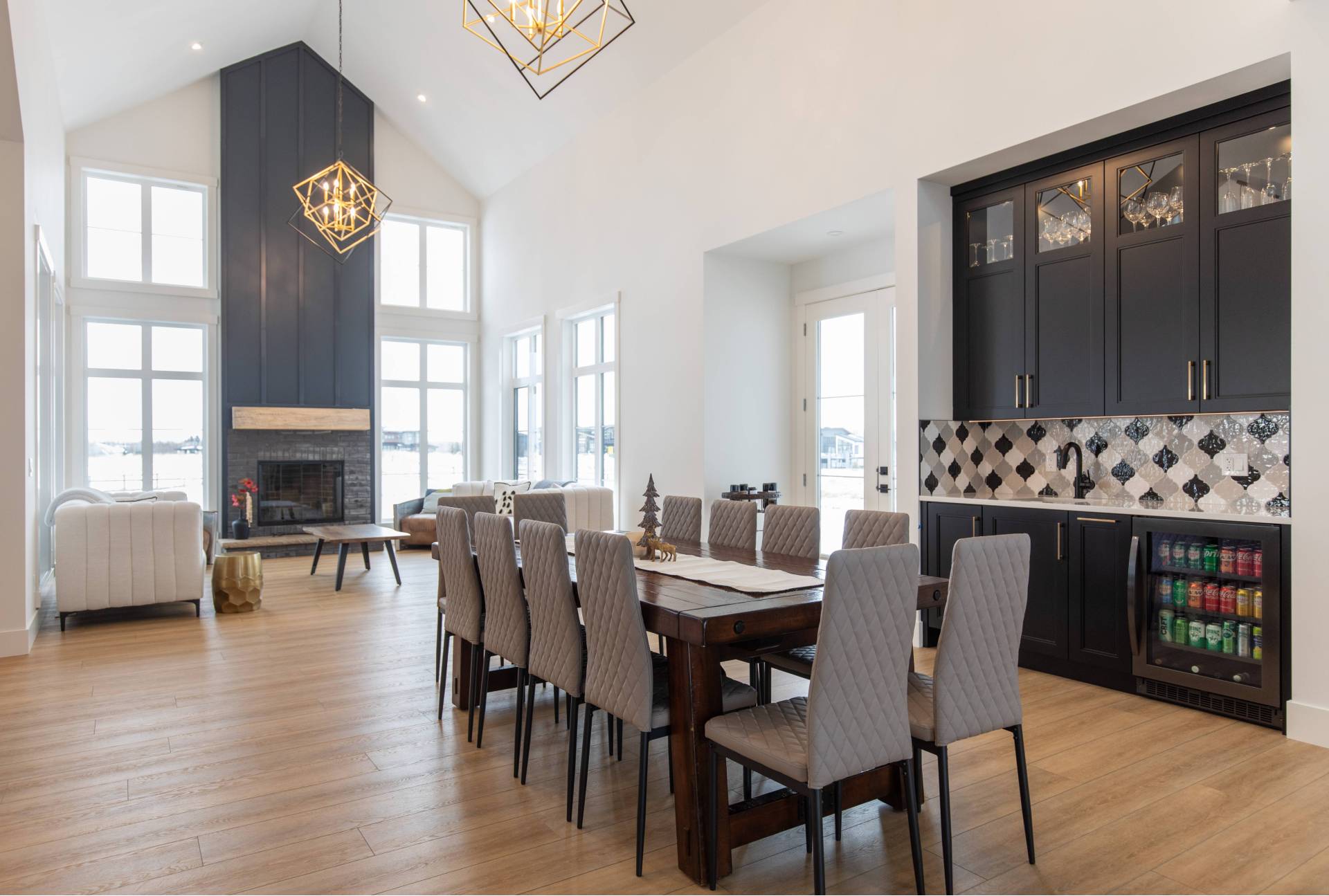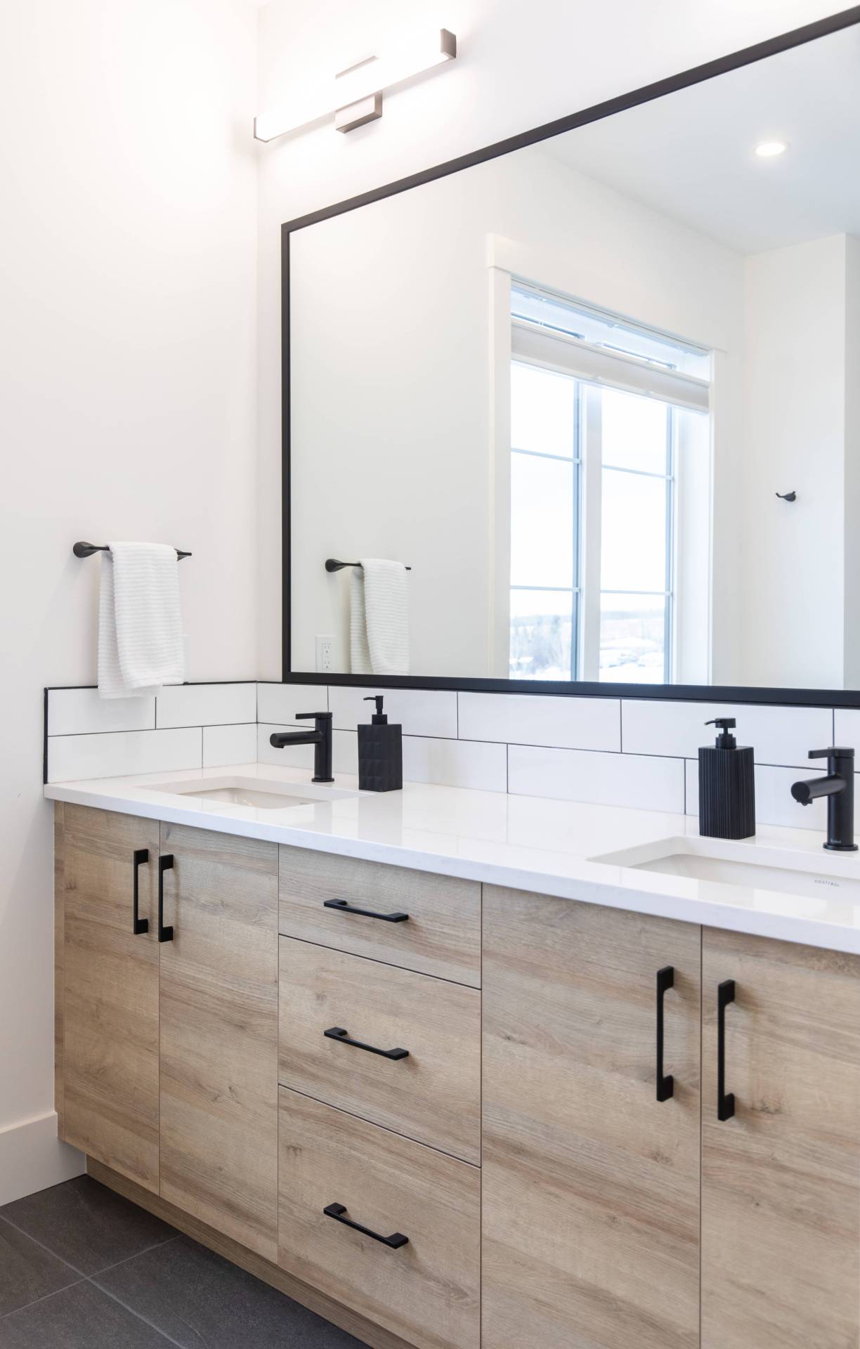 Widesky Custom Homes has recently completed this stunning new build in the community of Silverhorn that showcases their commitment to luxury and innovation. It was a pleasure to work with this lovely client on the design of their new home. The home features a striking dark kitchen creating a bold and sophisticated atmosphere. Contrasting the moody kitchen, the powder room boasts an eye-cathcing combination of black tile and rose gold plumbing fixtures adding a touch of glamour to the house.