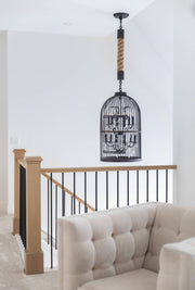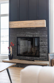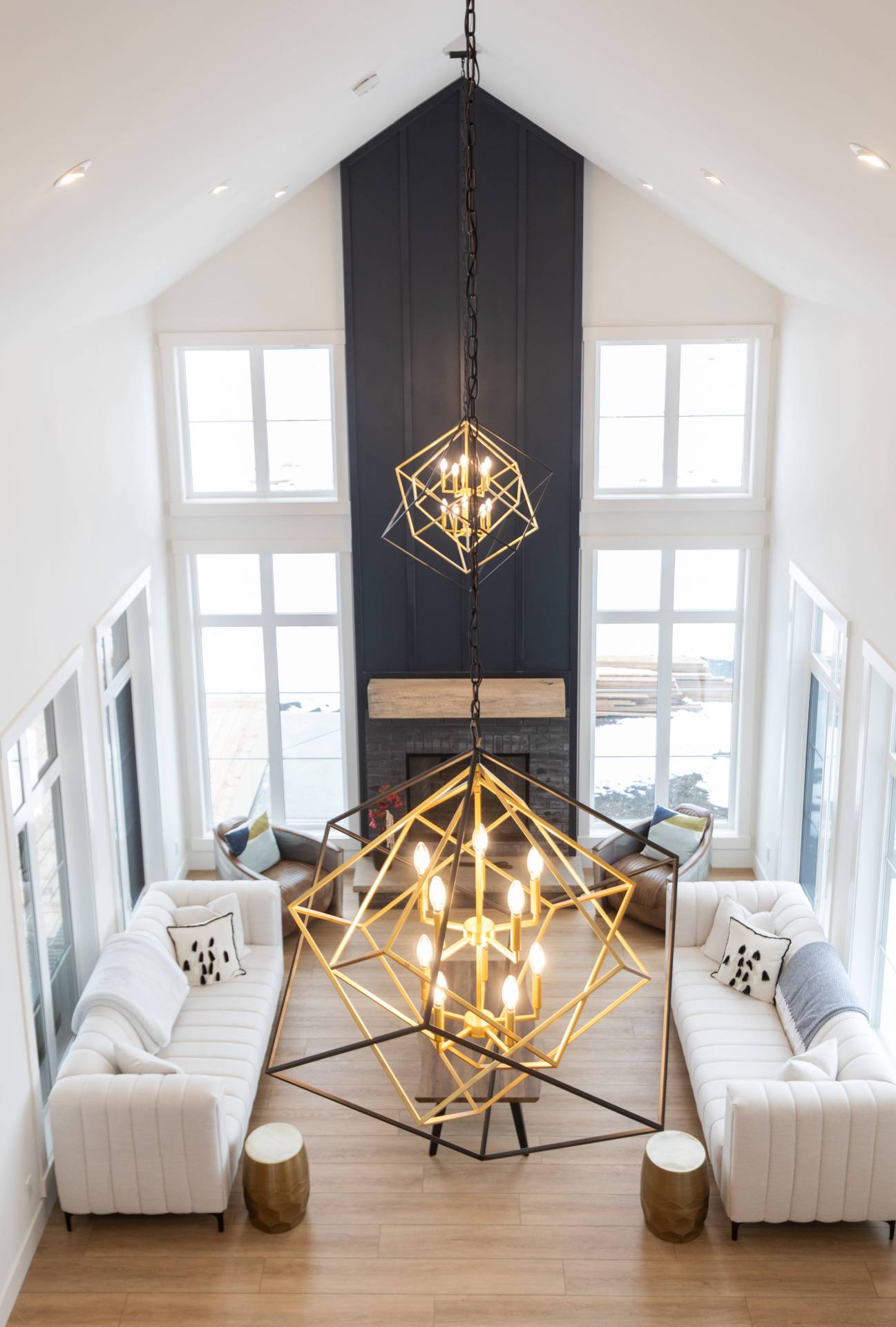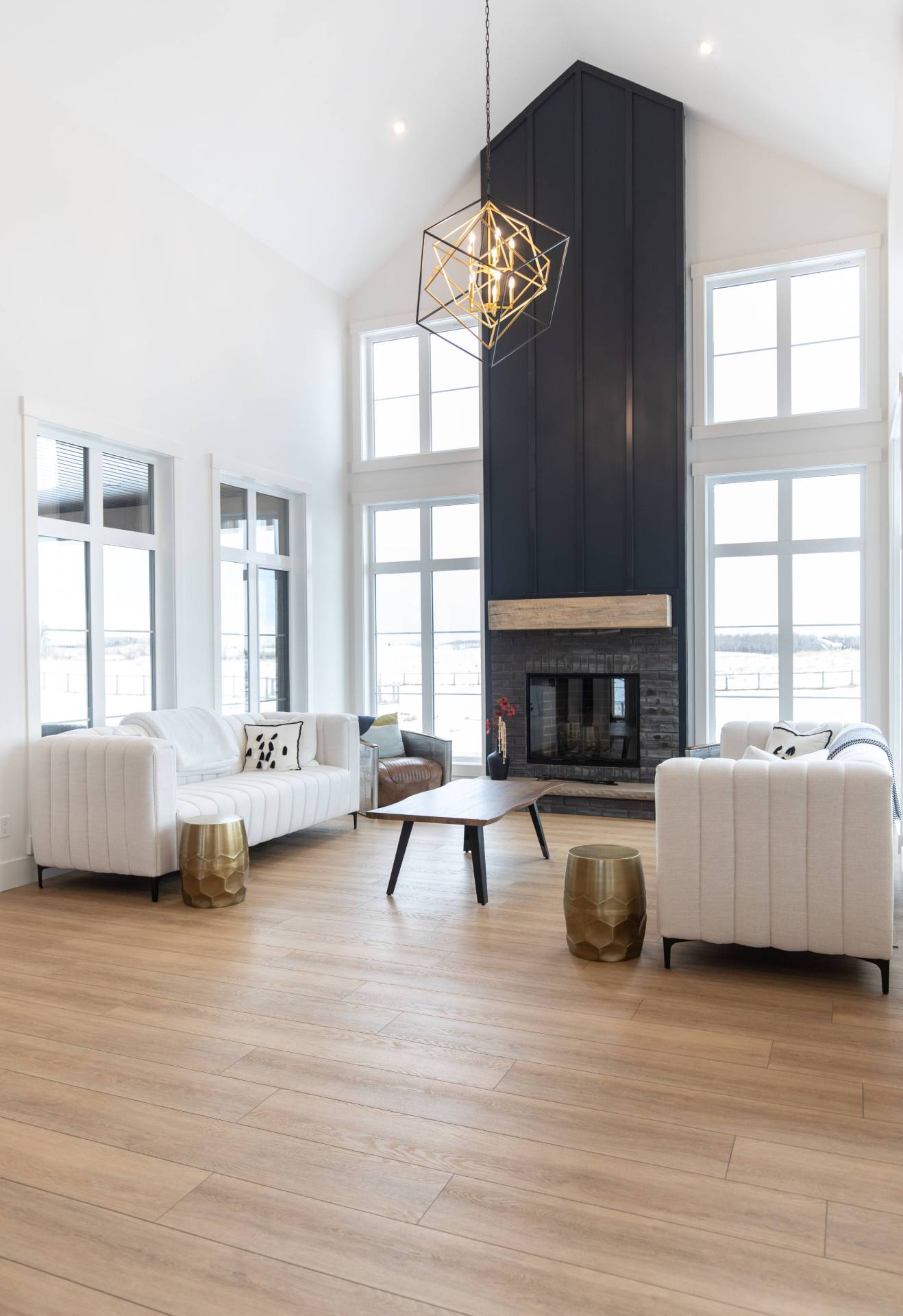 A dark, moody fireplace serves as the captivation focal point in this new build home that embraces a sophisticated back-and-white color scheme. These striking design choices create a harmonious balance between contemporary elegance and cozy ambiance throughout this home.