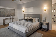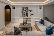 We were thrilled to design this elevated transitional home on Toronto Crescent in Calgary, AB, in collaboration with Altitude Group. Thoughtful details define every space, from the custom plastered hood fan and arched architectural elements to the sophisticated basement bar with its brick backsplash. The kitchen, crafted by Legacy Kitchens, features perimeter cabinets in Benjamin Moore Sea Salt CSP-95 paired with warm Legacy Kitchens White Rift Oak stained Ridge. Timeless Okanagan Sorrento Oak hardwood grounds the main floor. A green paneled dining room and a rich, moody office painted in Sherwin Williams Thunderous SW620 (including baseboards and casing) add character and depth. Styled by Dezin Group Home Staging (@dezingroup) and beautifully captured by Alex Real Photo (@alex_real_photo), this home is a true reflection of elevated Calgary luxury.